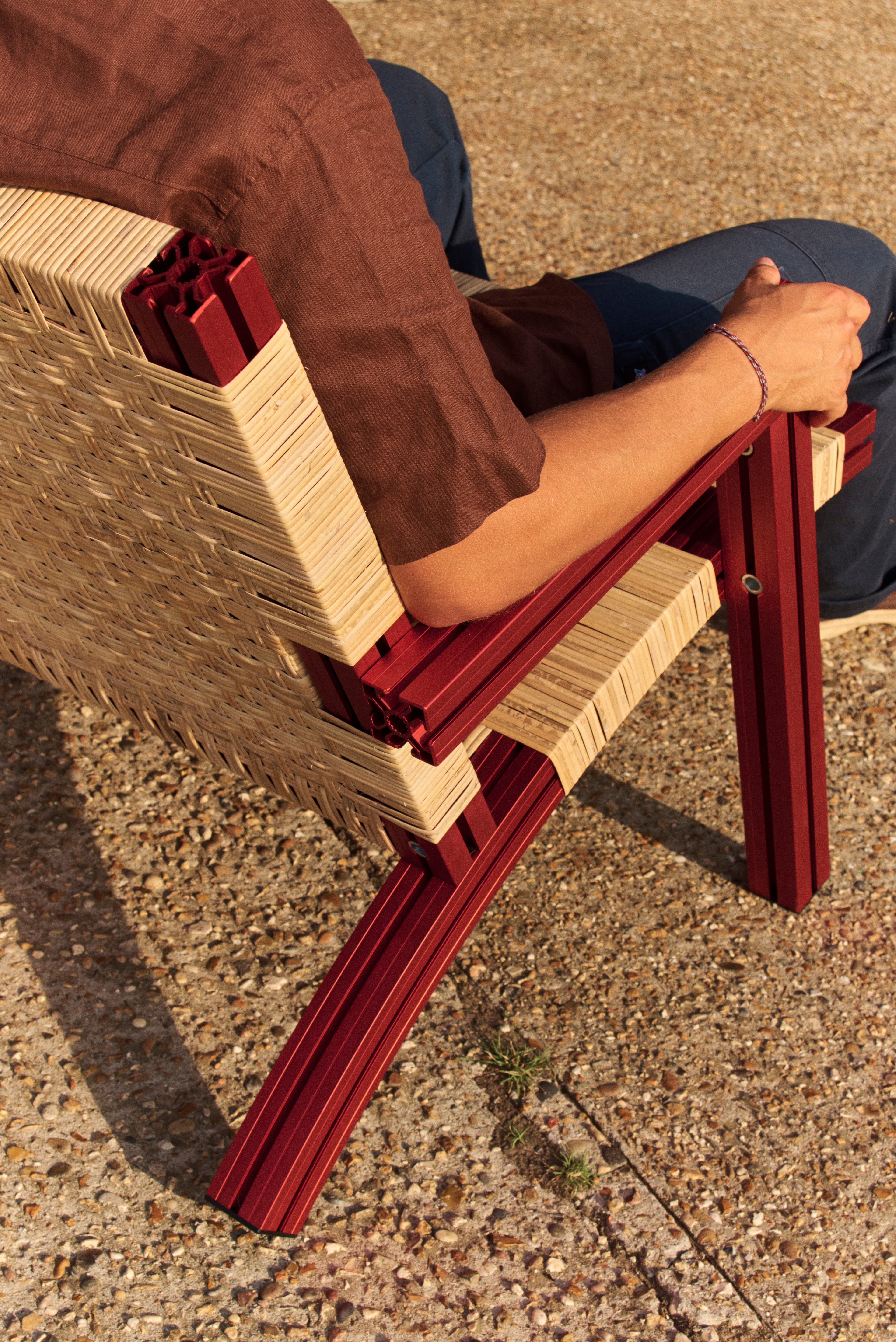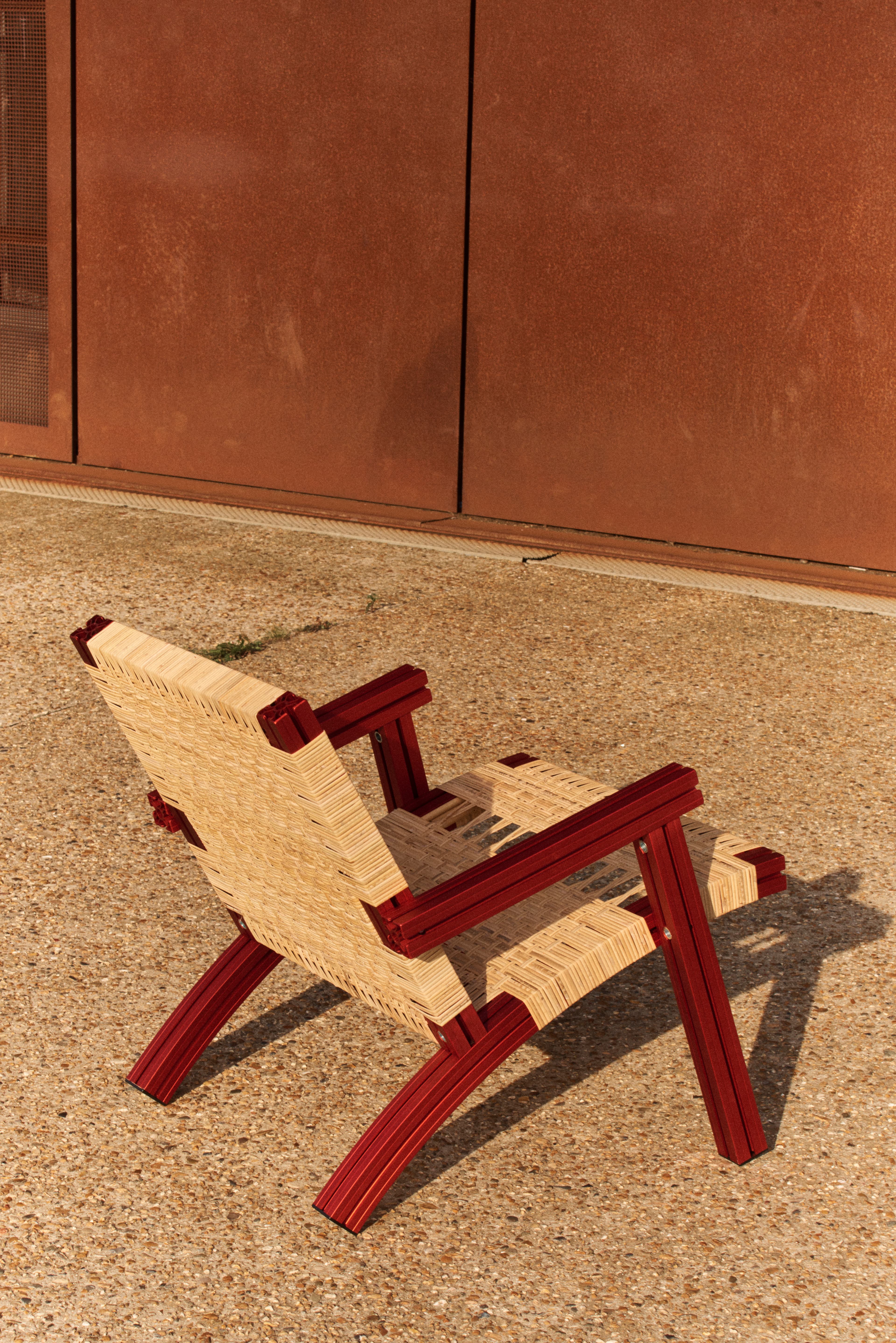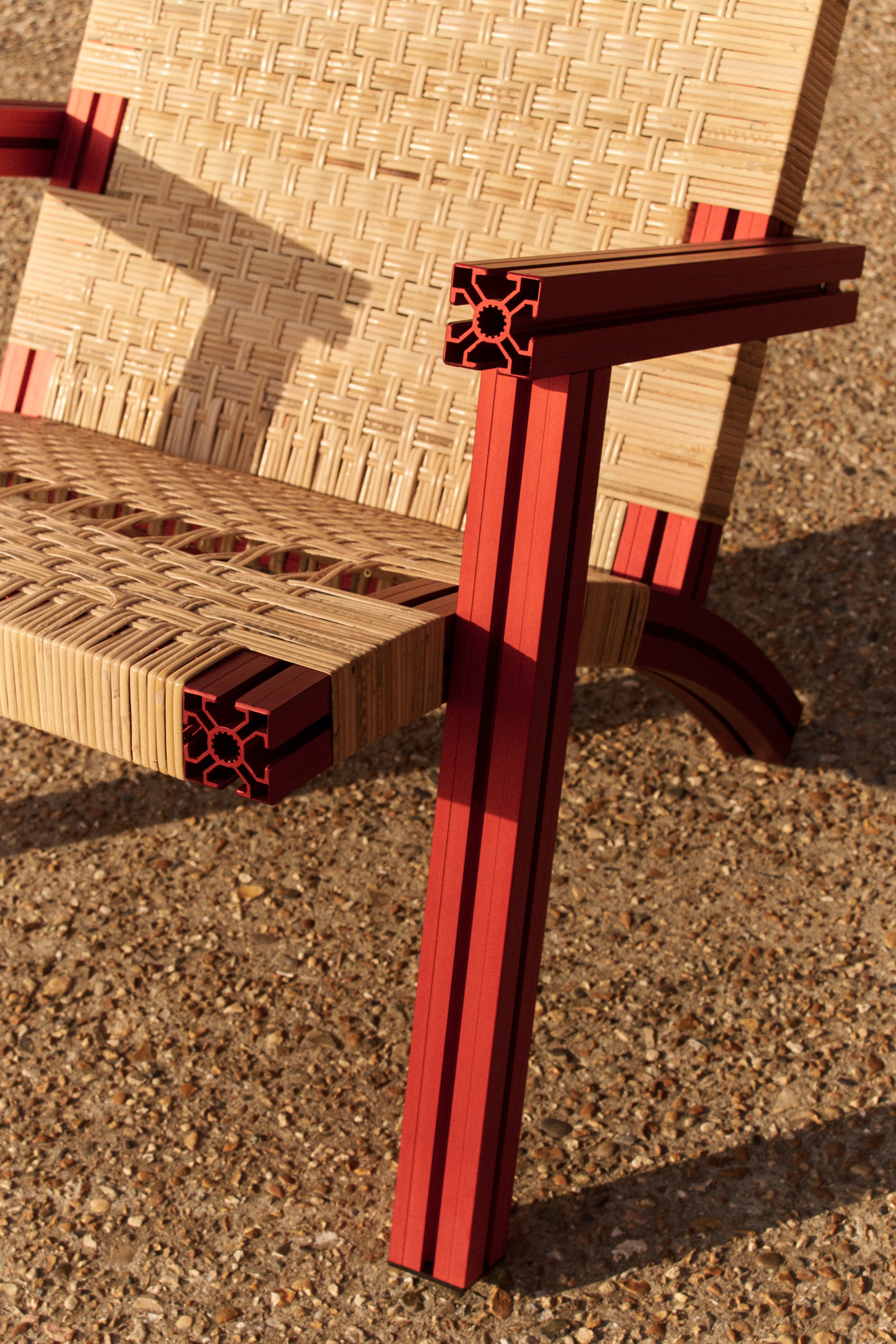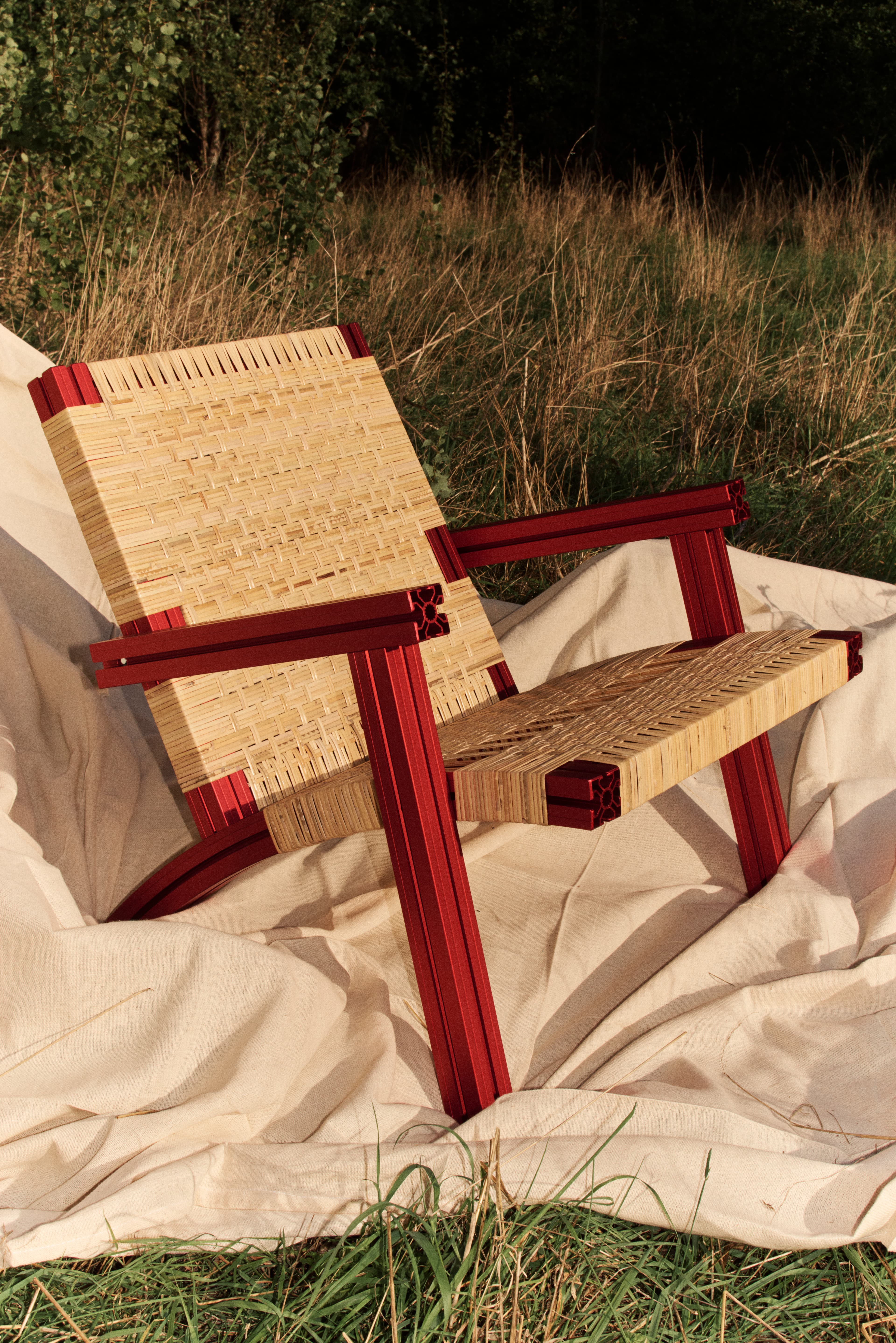 The armchair is an addition to the Anodised Wicker collection. It is inspired by Hans Wegner's designs from the 1950s and their intricate cane work. To realise this piece the aluminium extrusions had to be CNC-bent and cut at extremely precise angles pushing the workshop's boundaries.