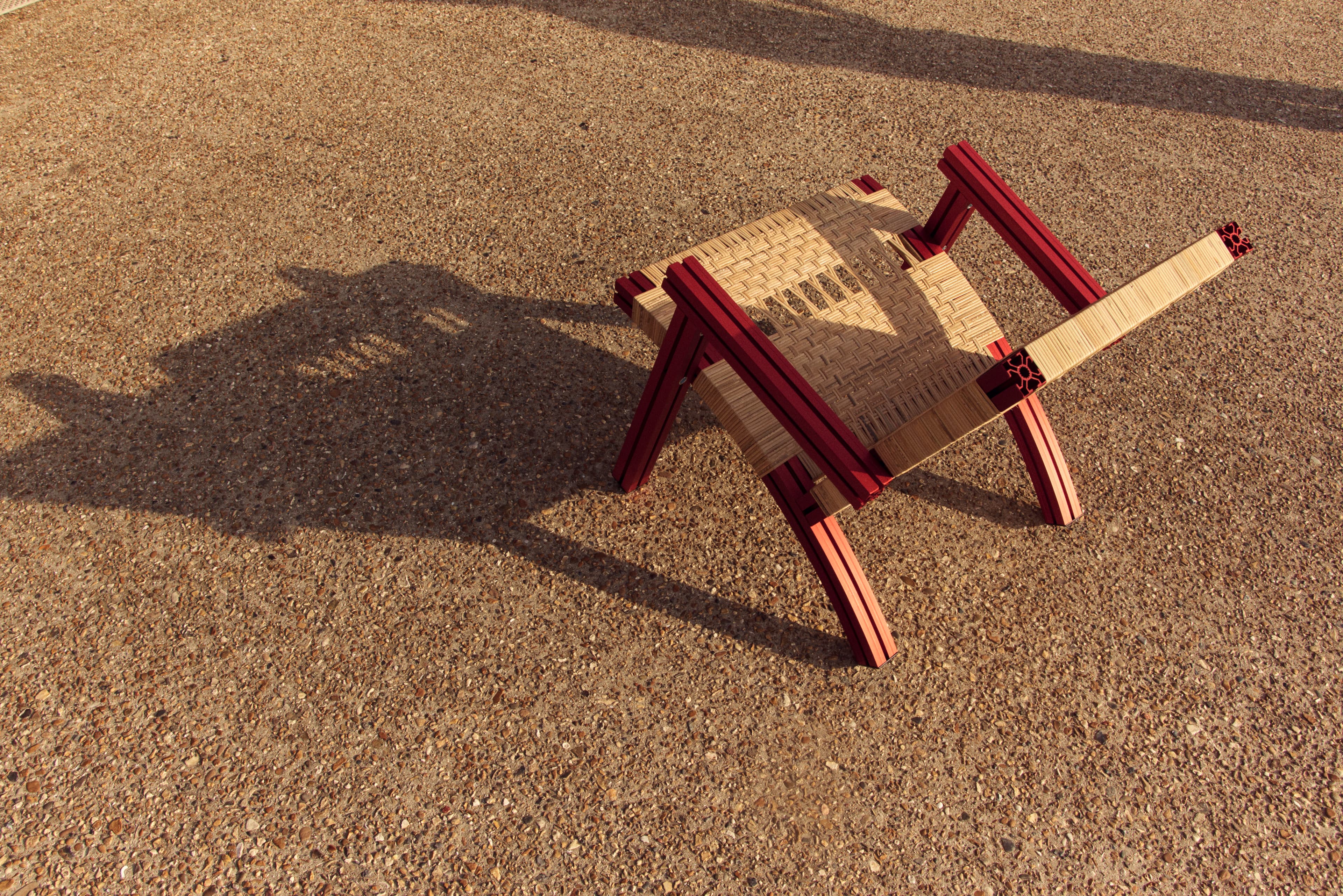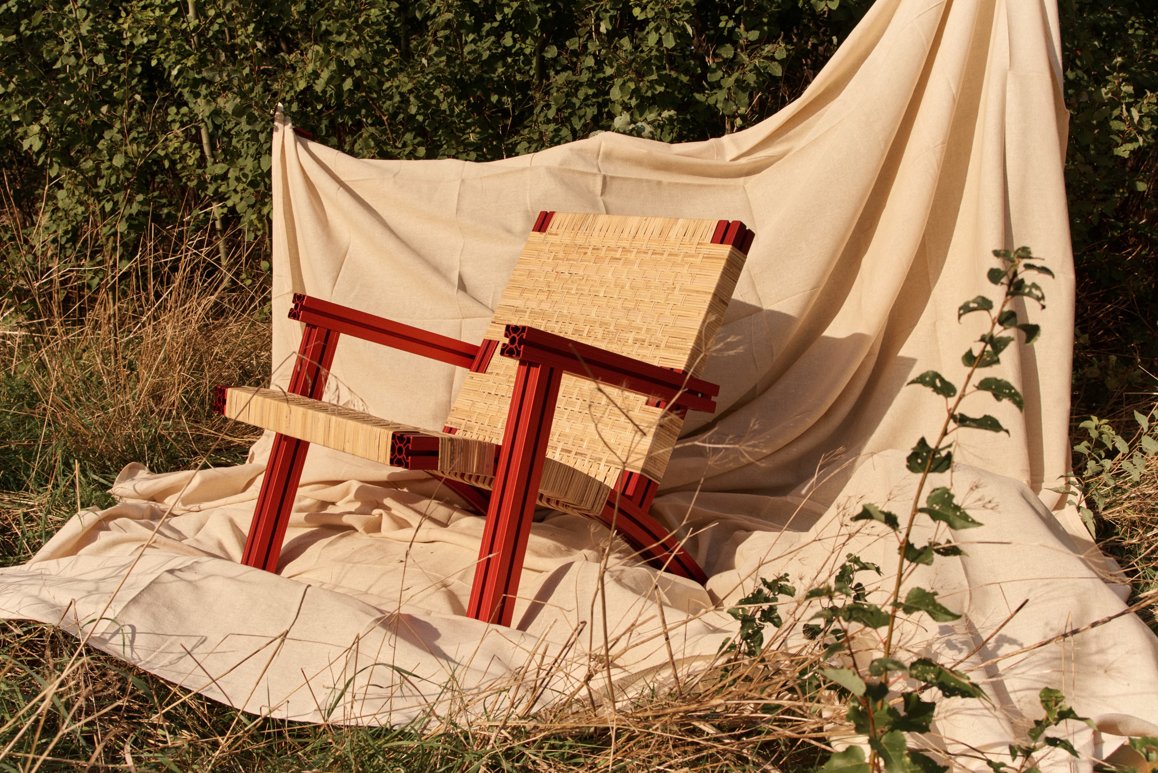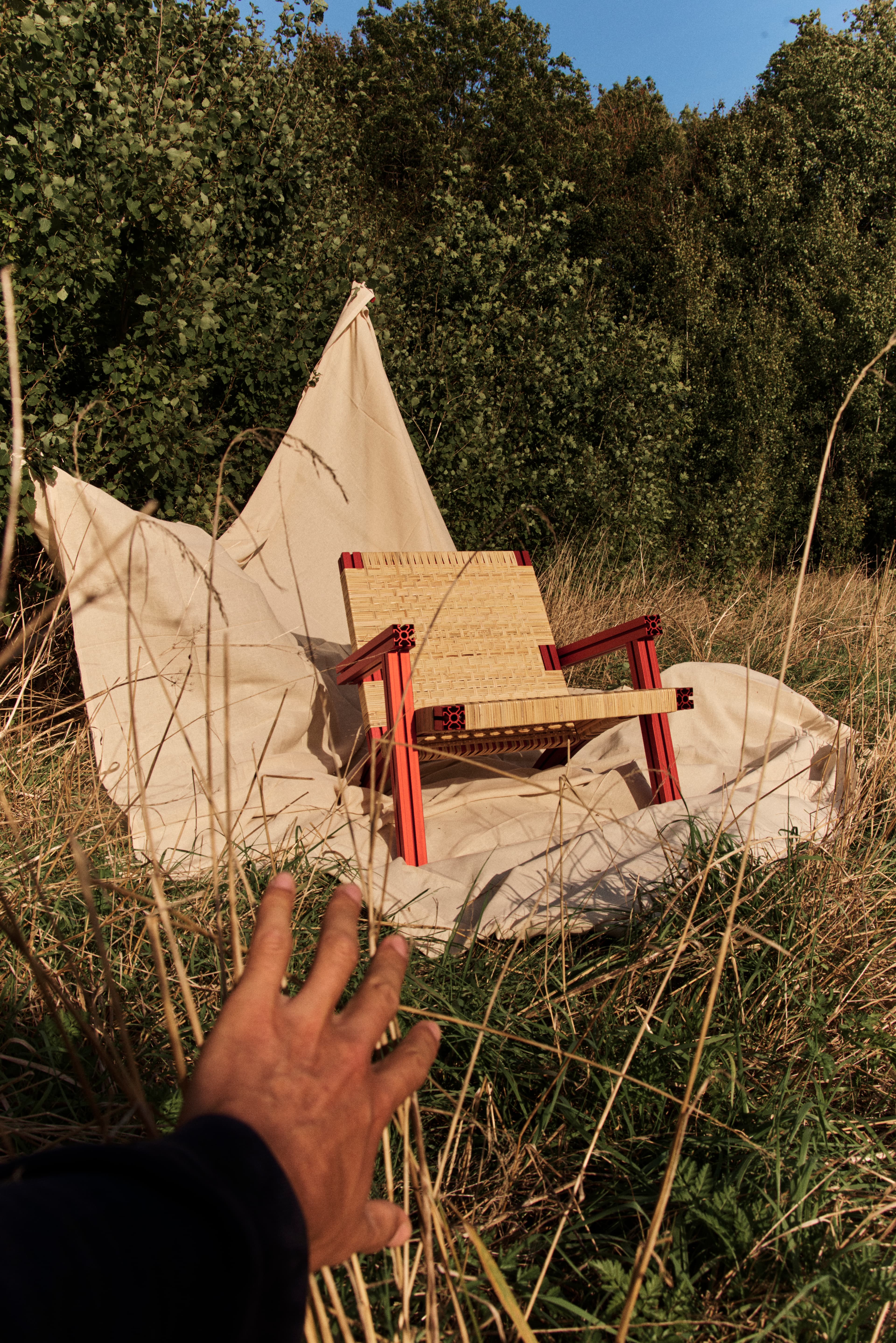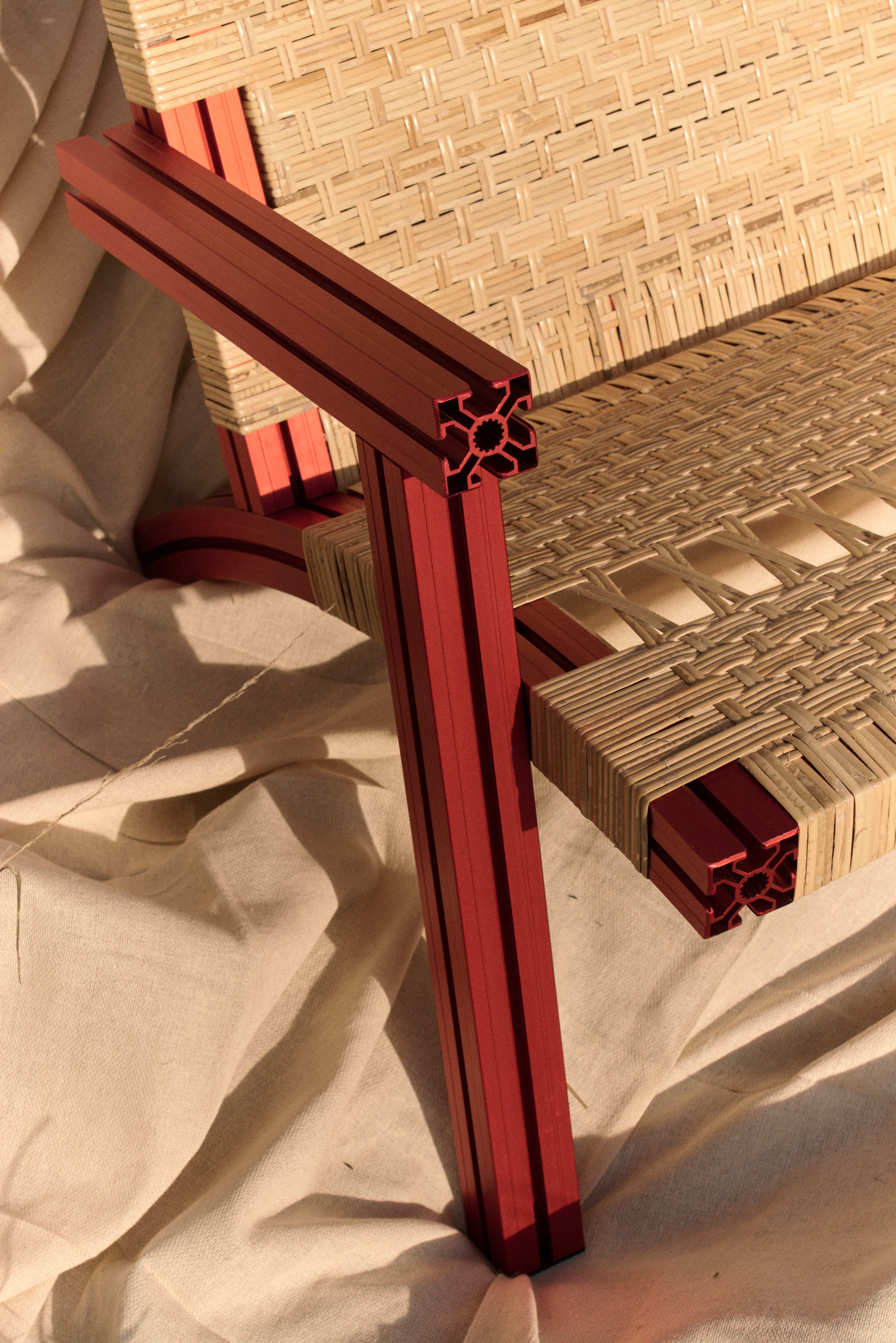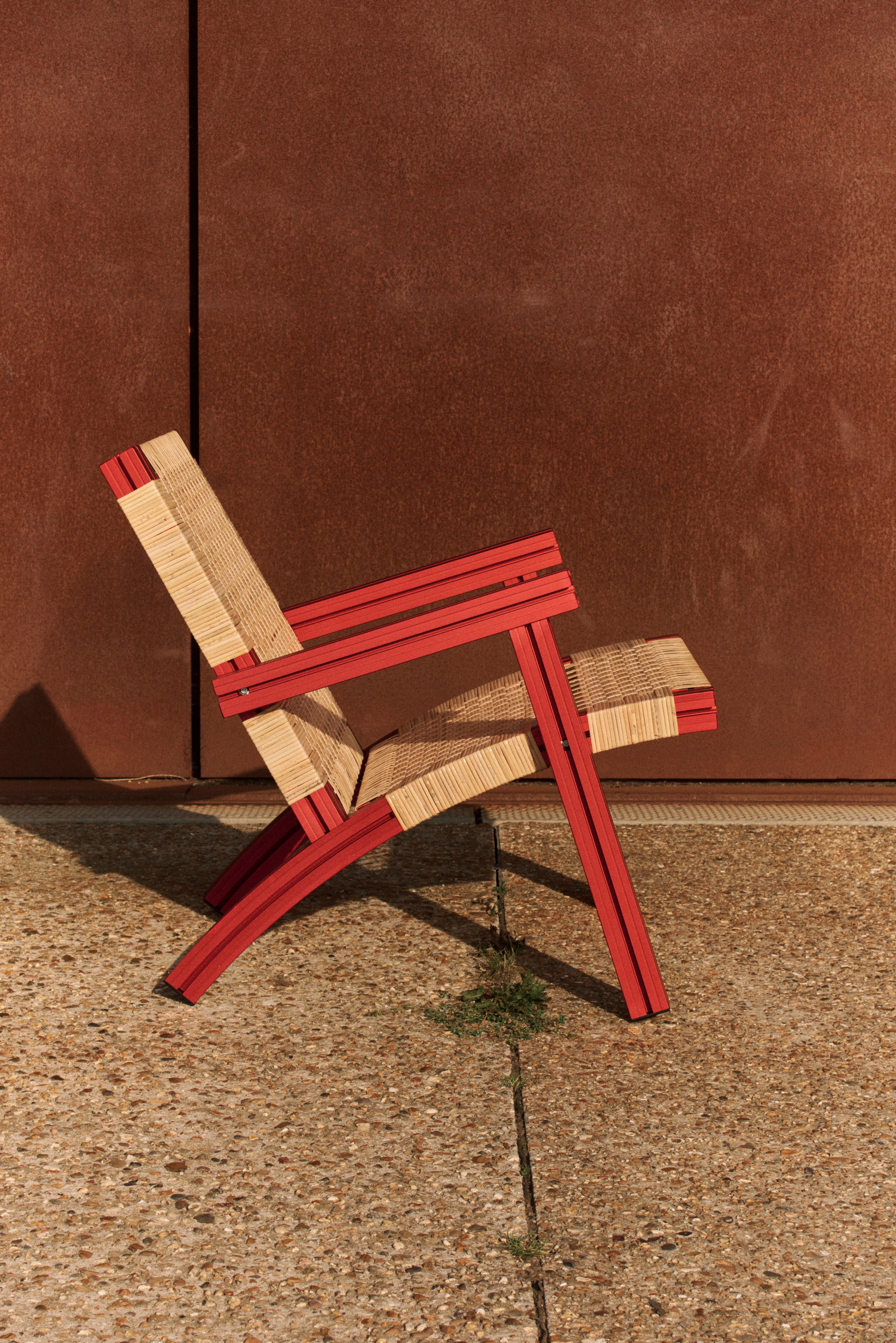 The armchair is an addition to the Anodised Wicker collection. It is inspired by Hans Wegner's designs from the 1950s and their intricate cane work. To realise this piece the aluminium extrusions had to be CNC-bent and cut at extremely precise angles pushing the workshop's boundaries.